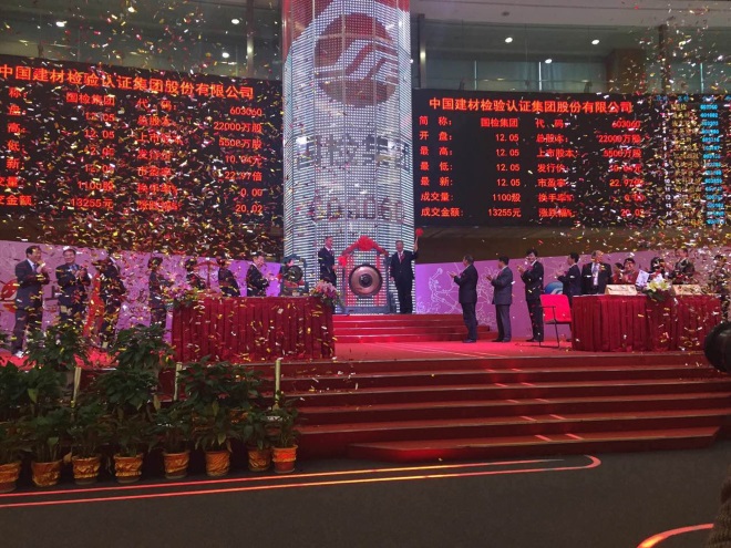 2016年11月9日,中國(guó)建材檢驗(yàn)認(rèn)證集團(tuán)股份有限公司(以下簡(jiǎn)稱“國(guó)檢集團(tuán)”)在上海證券交易所成功掛牌上市。中國(guó)建筑材料聯(lián)合會(huì)會(huì)長(zhǎng)喬龍德,中國(guó)建材集團(tuán)有限公司董事長(zhǎng)宋志平,中國(guó)建材集團(tuán)有限公司副董事長(zhǎng)、中國(guó)建筑材料科學(xué)研究總院院長(zhǎng)、國(guó)檢集團(tuán)董事長(zhǎng)姚燕,上海證券交易所副理事長(zhǎng)張冬科,安信證券副總裁秦沖,中國(guó)建材集團(tuán)有限公司外部董事趙吉斌、沙鳴、張燕玲,中國(guó)標(biāo)準(zhǔn)化研究院院長(zhǎng)馬林聰,國(guó)家質(zhì)量監(jiān)督檢驗(yàn)檢疫總局原總工程師、國(guó)際質(zhì)量科學(xué)院院士劉卓慧,中國(guó)分析測(cè)試協(xié)會(huì)副會(huì)長(zhǎng)兼秘書長(zhǎng)張渝英等出席掛牌儀式。期間宋志平、姚燕、秦沖分別致辭,姚燕與張冬科分別代表國(guó)檢集團(tuán)和上海證券交易所簽訂《上市協(xié)定書》并互贈(zèng)上市紀(jì)念品。國(guó)檢集團(tuán)在A股市場(chǎng)正式亮相。