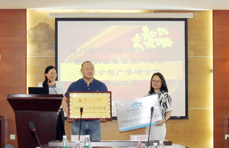 簽約儀式上, CTC廈門宏業(yè)與廈門理工學(xué)院分別對本單位的綜合情況進(jìn)行了系統(tǒng)的介紹。秦憲明董事長和環(huán)境科學(xué)與工程學(xué)院副院長(主持)傅海燕、土木工程與建筑學(xué)院副院長(主持)錢長照代表雙方分別簽署了產(chǎn)學(xué)研合作協(xié)議,并互贈牌匾,雙方正式達(dá)成產(chǎn)學(xué)研合作關(guān)系。公司在廈門理工學(xué)院掛牌“中國建材檢驗認(rèn)證集團(tuán)廈門宏業(yè)有限公司產(chǎn)學(xué)研合作與人力資源培養(yǎng)基地”,廈門理工學(xué)院在公司掛牌“廈門理工學(xué)院環(huán)境科學(xué)與工程學(xué)院產(chǎn)學(xué)研合作與社會實踐基地”。隨后,秦憲明董事長和廈門理工學(xué)院土木工程與建筑學(xué)院黨委書記吳文慶分別致辭,對雙方順利建立產(chǎn)學(xué)研合作關(guān)系表示祝賀,并一致認(rèn)為該合作協(xié)議的簽署將進(jìn)一步深化校企合作。
